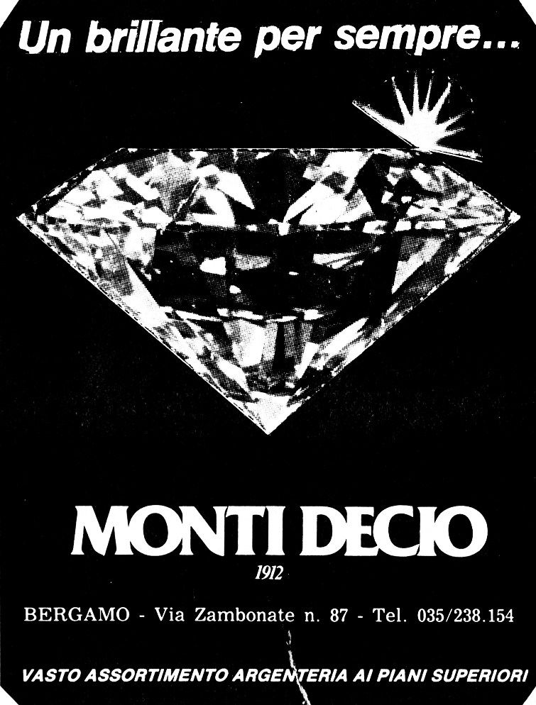 Monti Decio è la più antica gioielleria di Bergamo e provincia, e venne fondata nel 1912 da Decio Monti, stimato orafo che con le proprie creazioni originali ha reso famoso il negozio di via Zambonate. Alla fine degli anni Quaranta entrano nell'azienda il figlio Tullio, esperto orologiaio, e la moglie Mimma, prestigiosa designer di gioielli e dotata di spiccato senso imprenditoriale.
